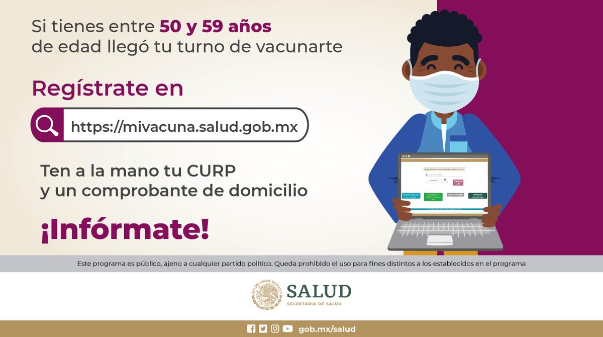 El sitio mivacuna.salud.gob.mx del gobierno de méxico ya permite registrar a los adultos de 50 a 59 años para recibir su vacuna desde la primera de mayo. Hasta ahora la página oficial no ha presentado ningún retraso. Regístrate y vacúnate si eres adulto mayor. Cómo, dónde y cuándo hay que hacerloreuters. Después de ingresar su curp y validar que no es un robot.